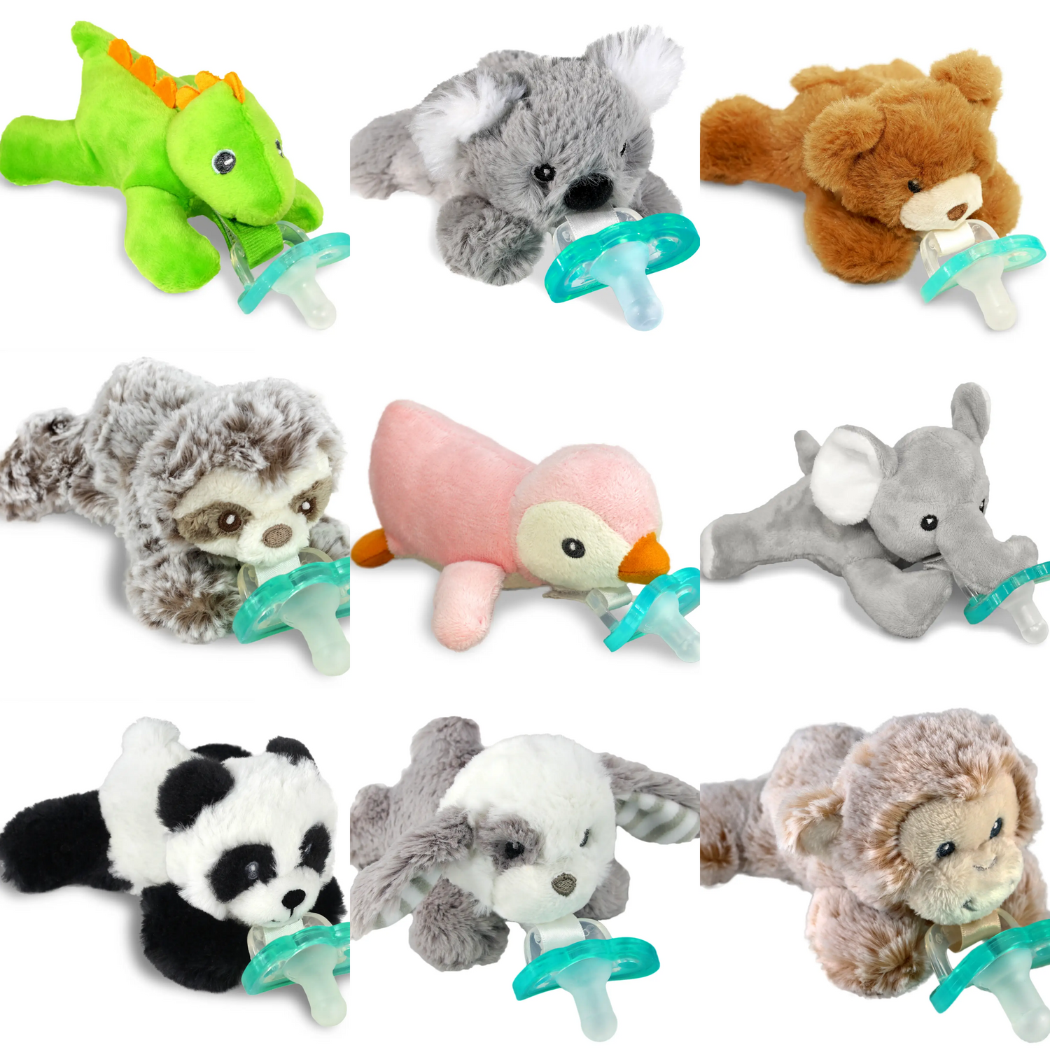 A jollypop pacifier held by a soft, huggable buddy will be your baby's (and all parent's) new best friend! And interchange the pacifier for a RaZberry teether as they get older.
