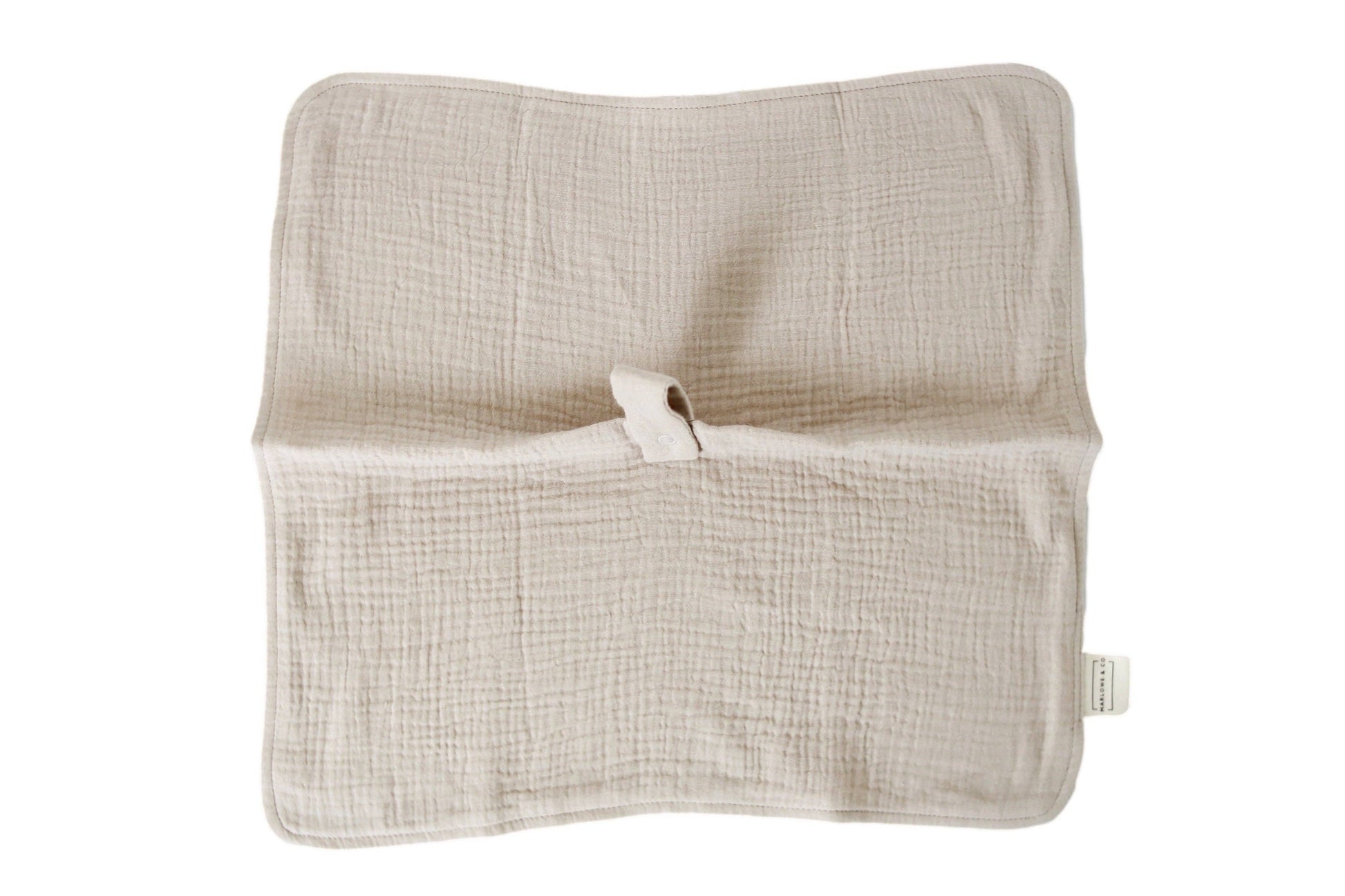Our natural sand lovey blanket with snap closure (Pacifier and Teether not Included) is made from a double layer of 100% soft organic cotton muslin that is soft and lightweight, perfect for all seasons and will not irritate sensitive skin.