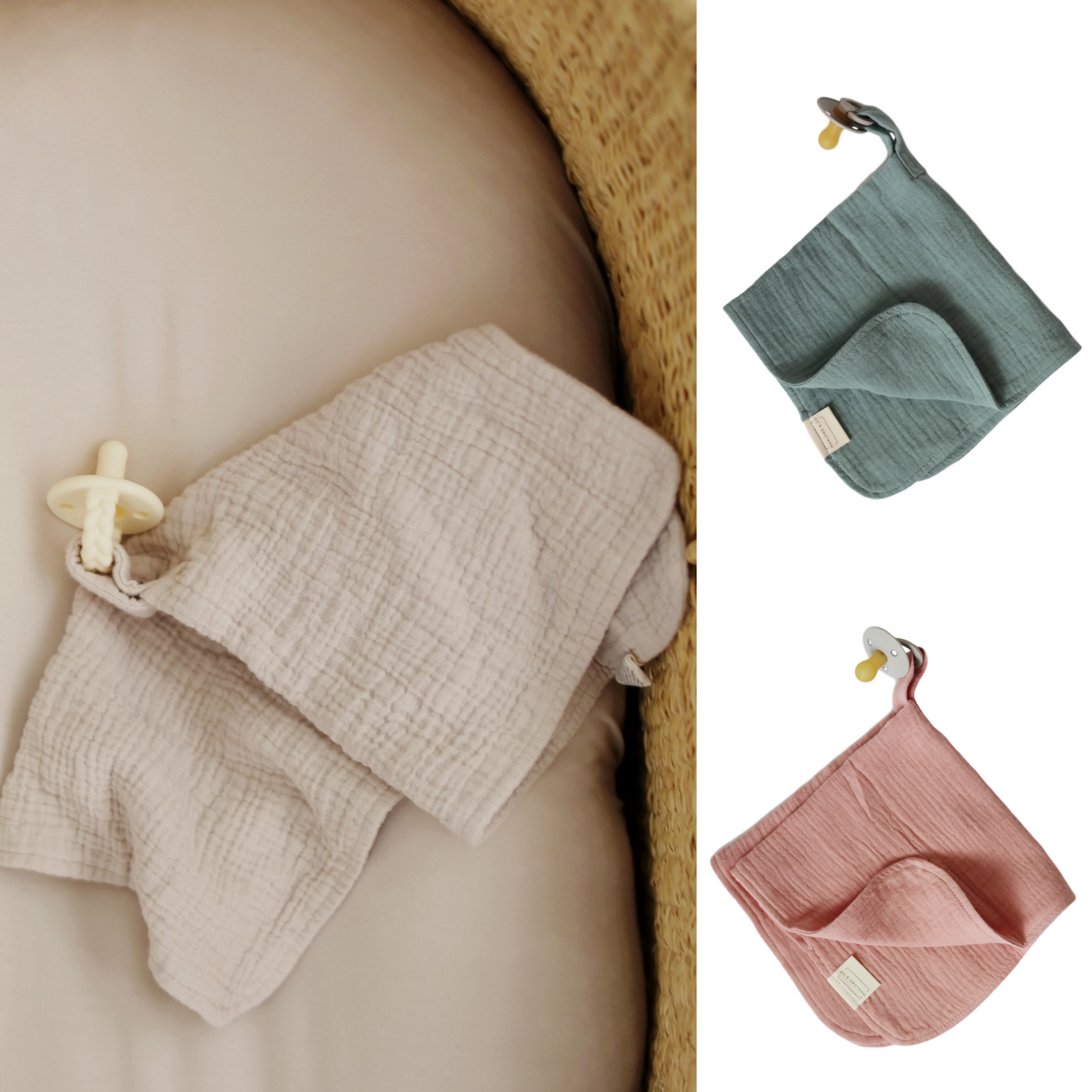 Simply attach your baby’s favorite pacifier or teether through the fabric loop in the center of the blanket and secure it with the snap closure. Your little one will love the added security of a soft blanket to cuddle with that’s just their size. Our unique design and the quality fabric of our blankets make them stand apart. Available in an array of modern beautiful colors that are neutral and timeless, our lovey blankets are sure to be appreciated by parents and babies alike.
