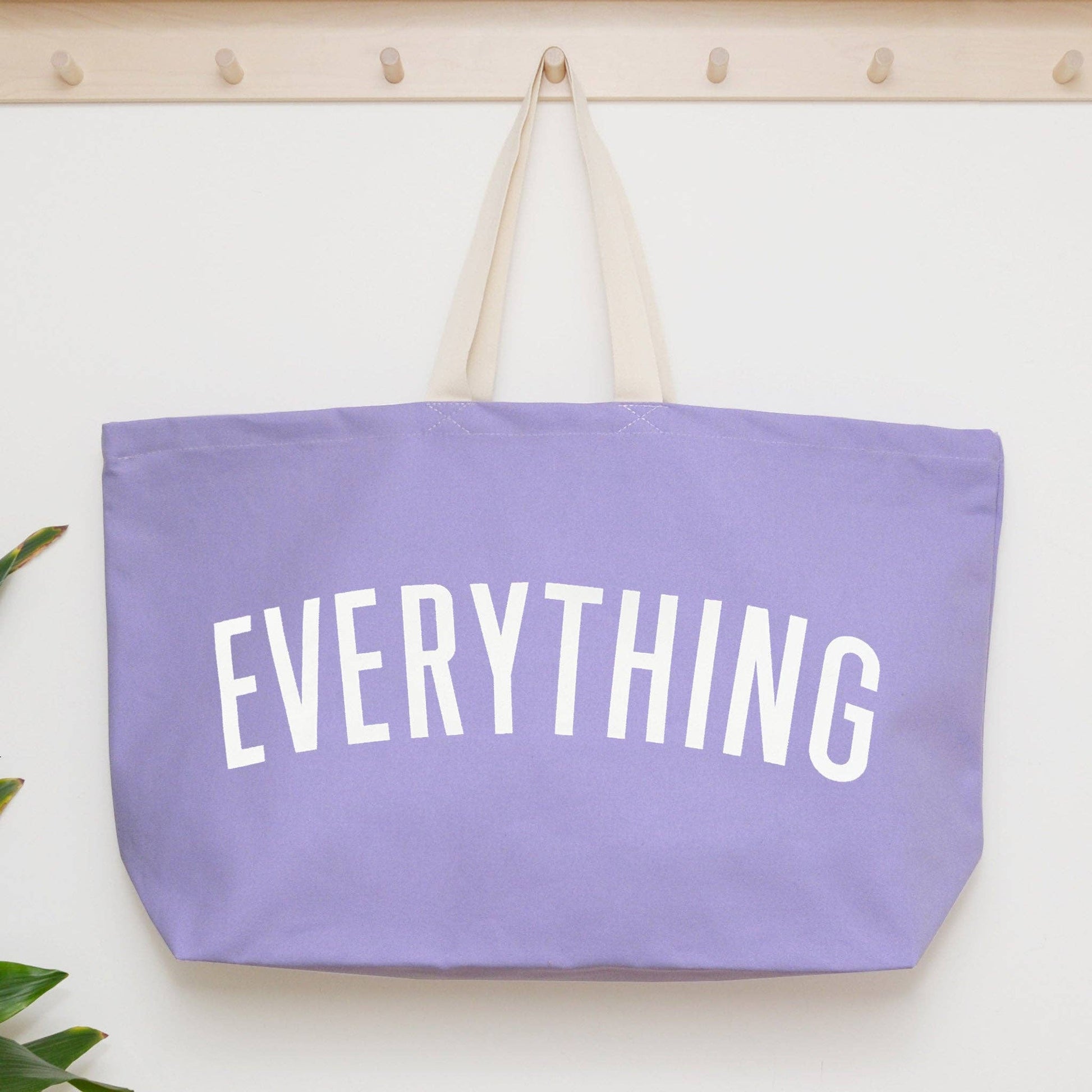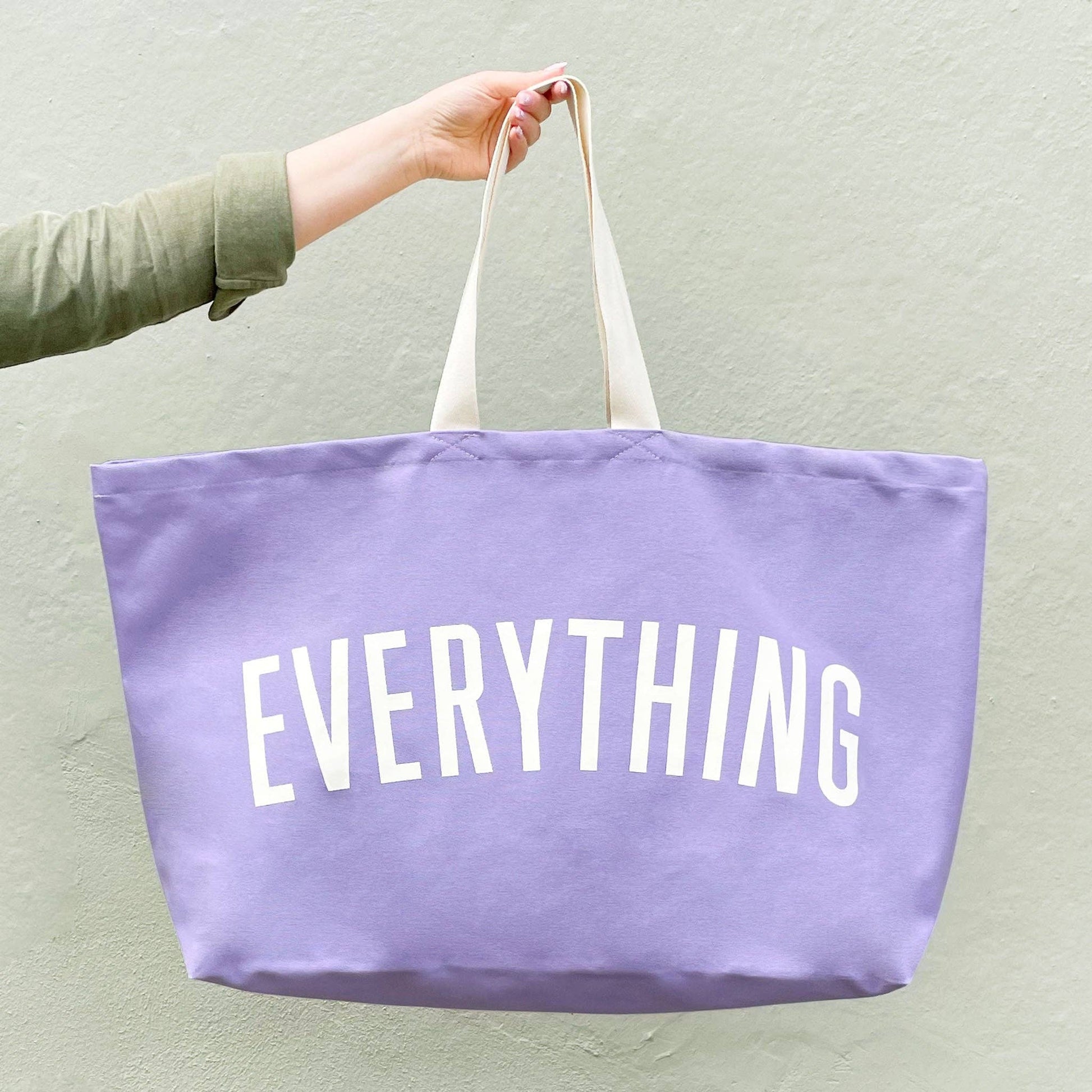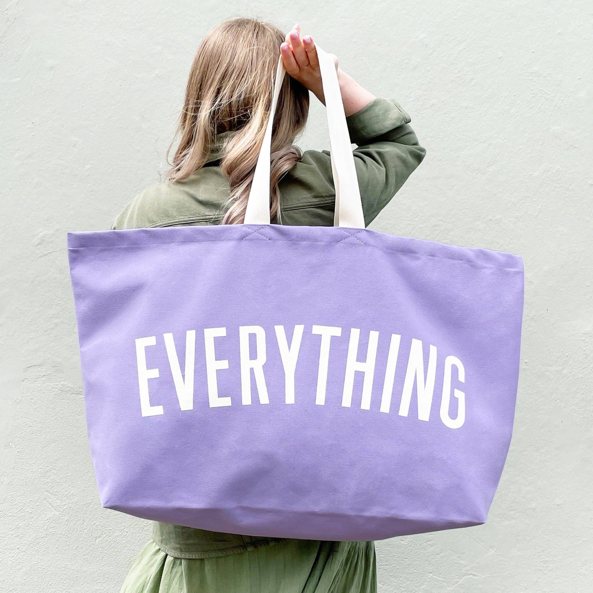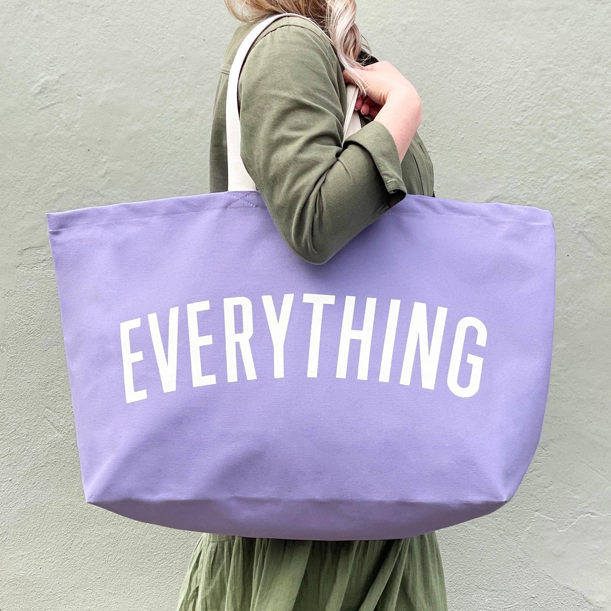 The original, and your favourite, EVERYTHING oversized tote, now available in lovely lavender canvas! Our REALLY big bags are REALLY useful. Perfect for the school run, beach days, weekends away and your big shop. Actually they are pretty handy for everything! Our EVERYTHING bag has been made from lovely thick lavender canvas, screen printed by hand big and bold in off-white. Lovingly stitched and printed in the UK. Hooray!