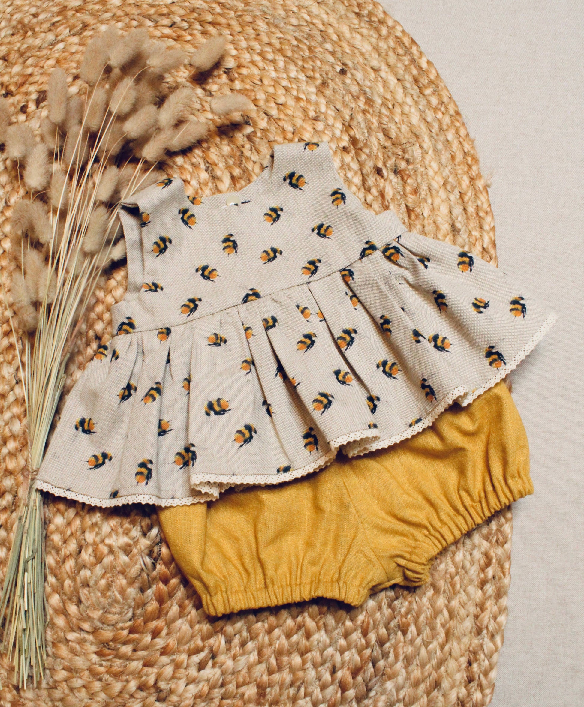 A beautiful bumble bee print angel top with complimenting mustard linen bloomers.