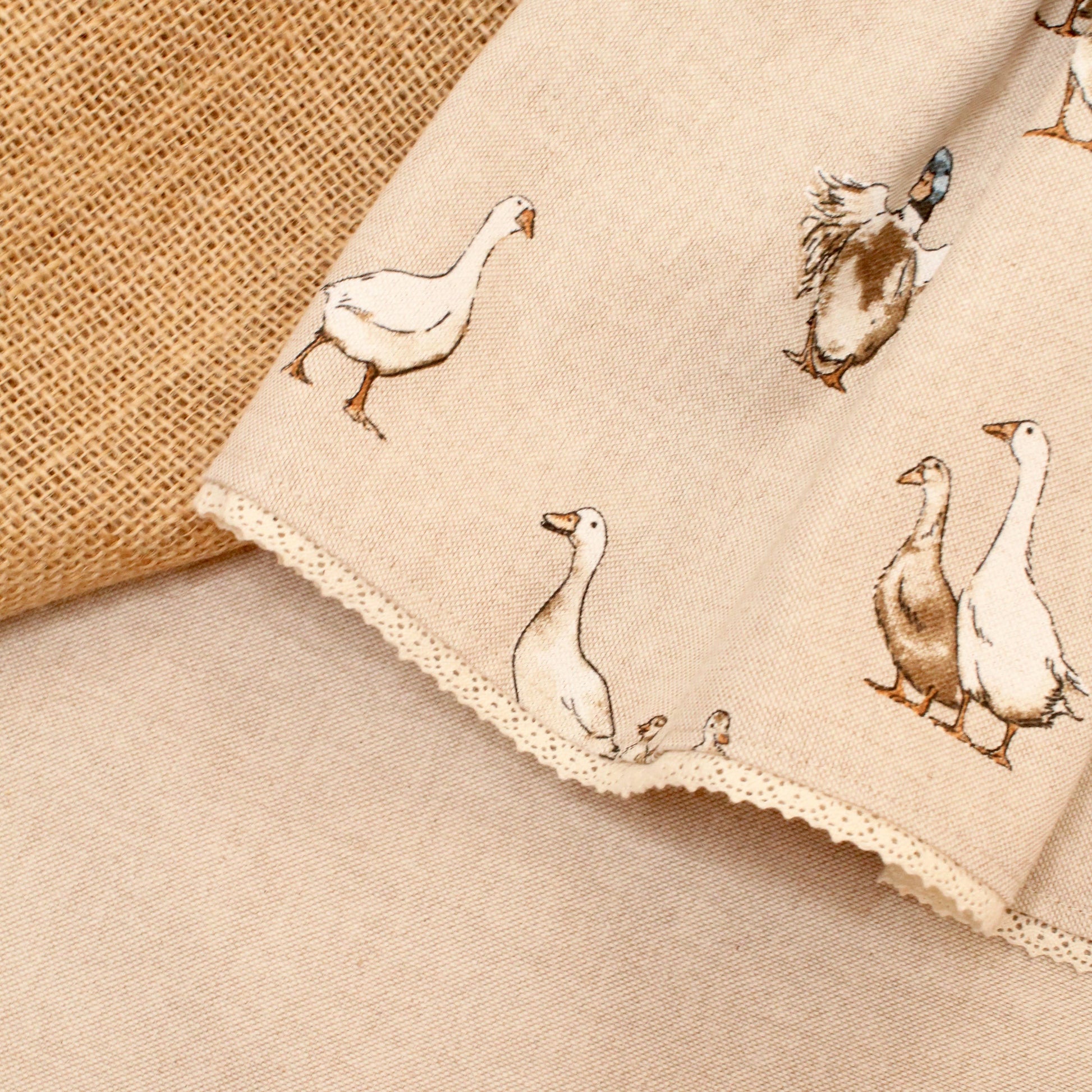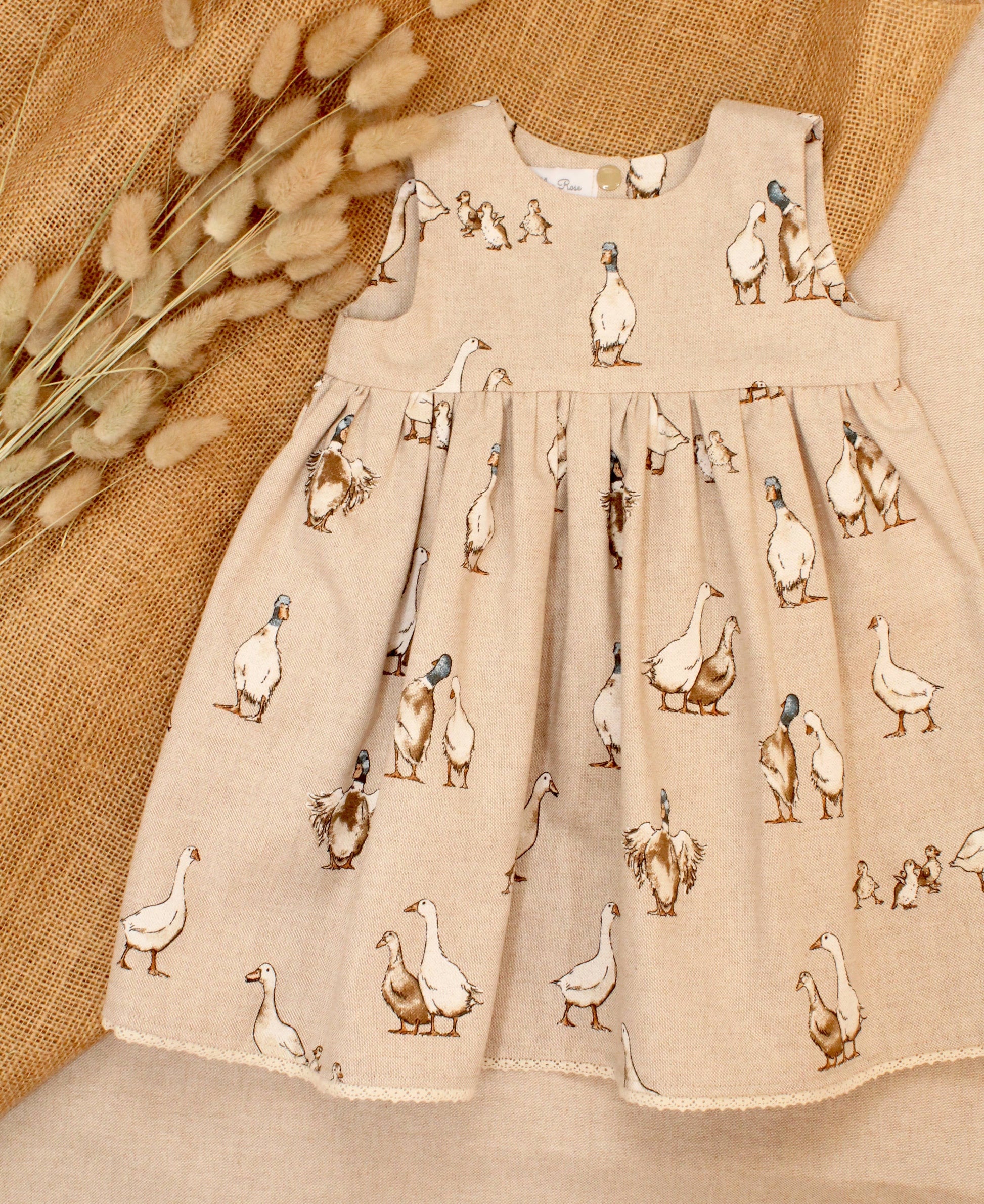 Beautiful duck print smock style dress, made from natural linen look cotton and finished with a cream cotton lace trim.